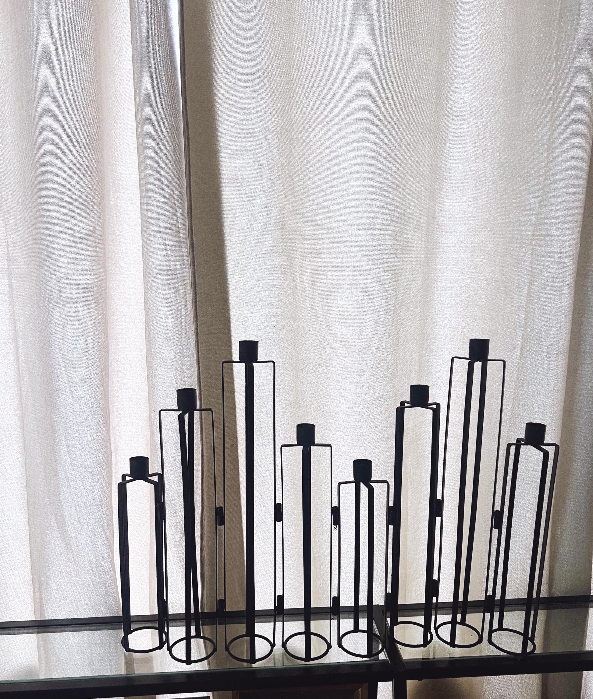 This striking black metal candle holder adds bold, sculptural elegance to any space. With tall, geometric frames and sleek matte black finish, these holders create a dramatic modern look whether displayed together as a centerpiece or styled individually around the home.