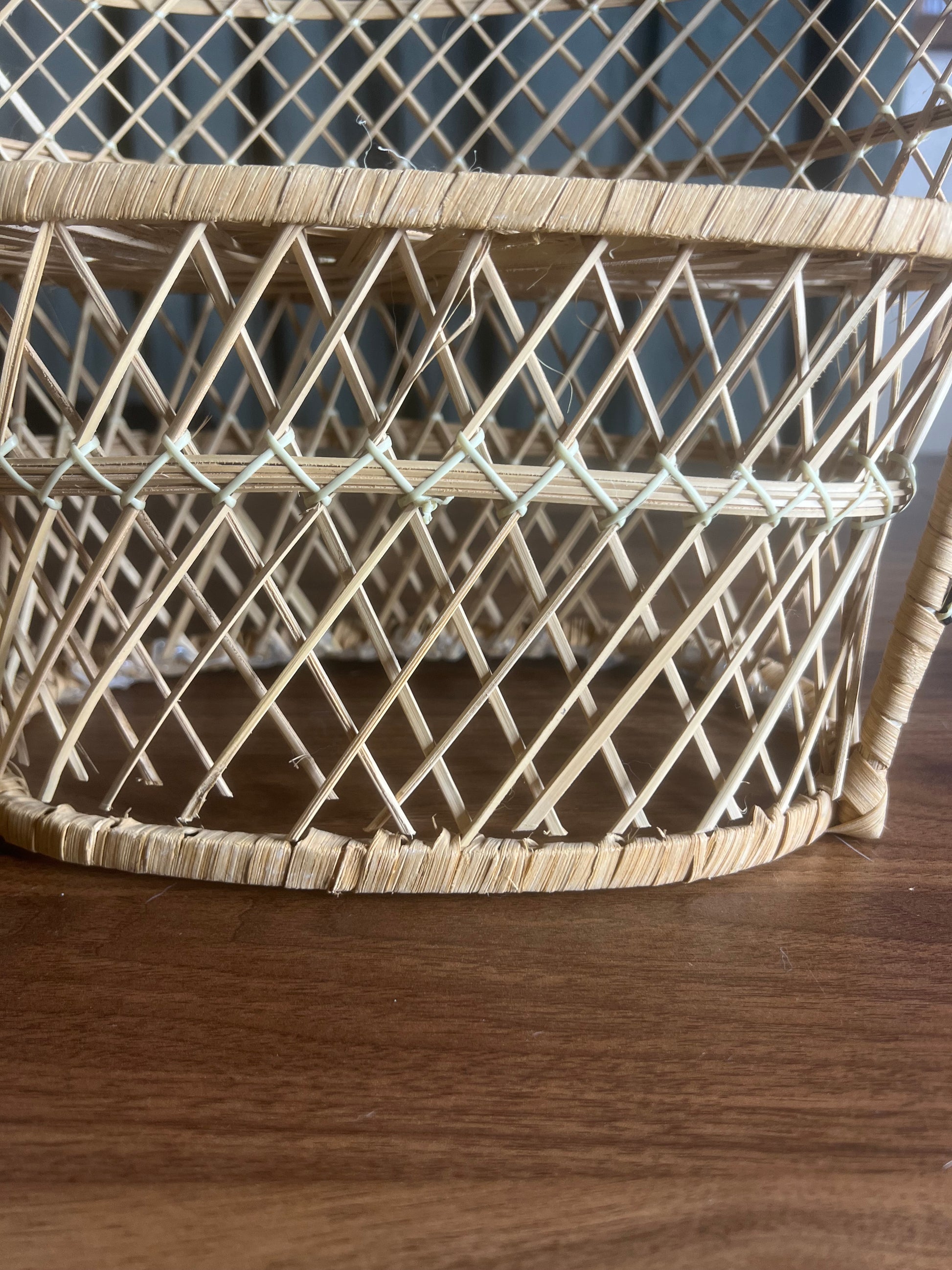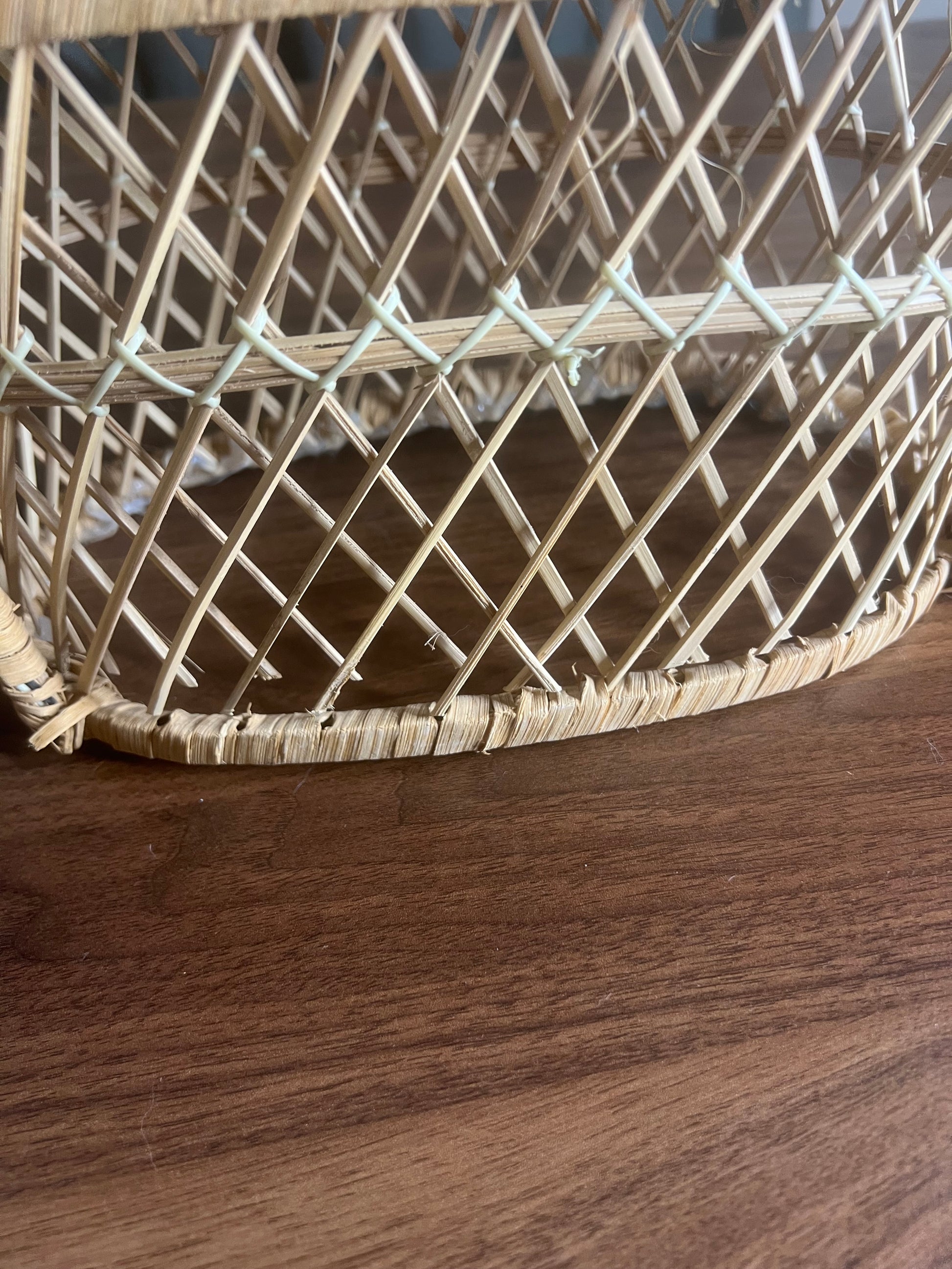 There is visible distressing along the bottom rim and lower weave, including fraying and small breaks consistent with vintage use and time. These details do not affect functionality and add to the character and authenticity of the piece.